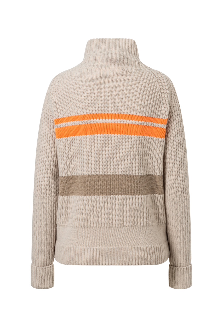 Adelia süveter, zarif blok şeritlerle şık, ince örgülü bir görünüme sahiptir. Geniş dik yaka ve sabit manşetler kadınsı bir havayı vurgularken, yeni yün ve teknoloji malzemesinin karışımı lüks bir his sağlar. Etek ucundaki yan logo fermuarlar, tasarımı ayrı bir siluetle tamamlar.